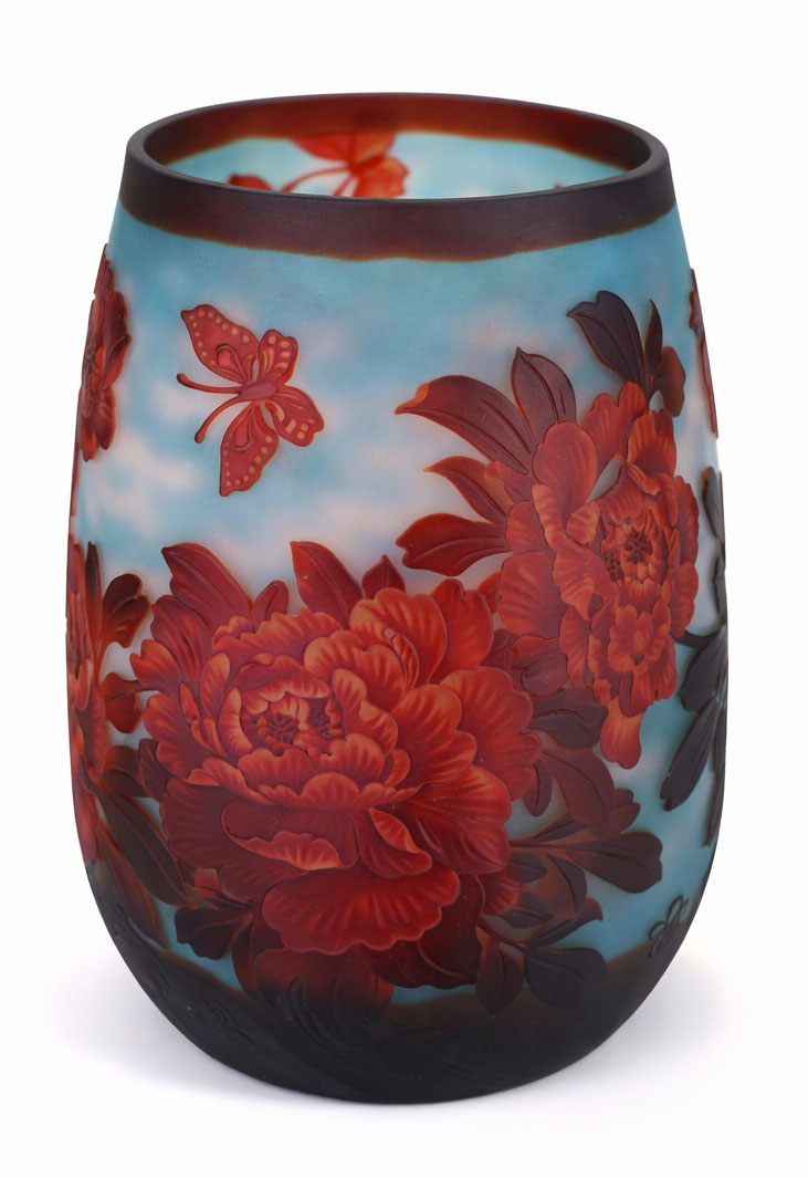 Die beeindruckende Jugendstil Glasvase „VILLA HORTA“ ist ein außergewöhnliches Sammlerstück der Glaskunst und eine stilvolle Hommage an die berühmten Glasarbeiten der Belle Époque, insbesondere an den legendären Glaskünstler Émile Gallé.