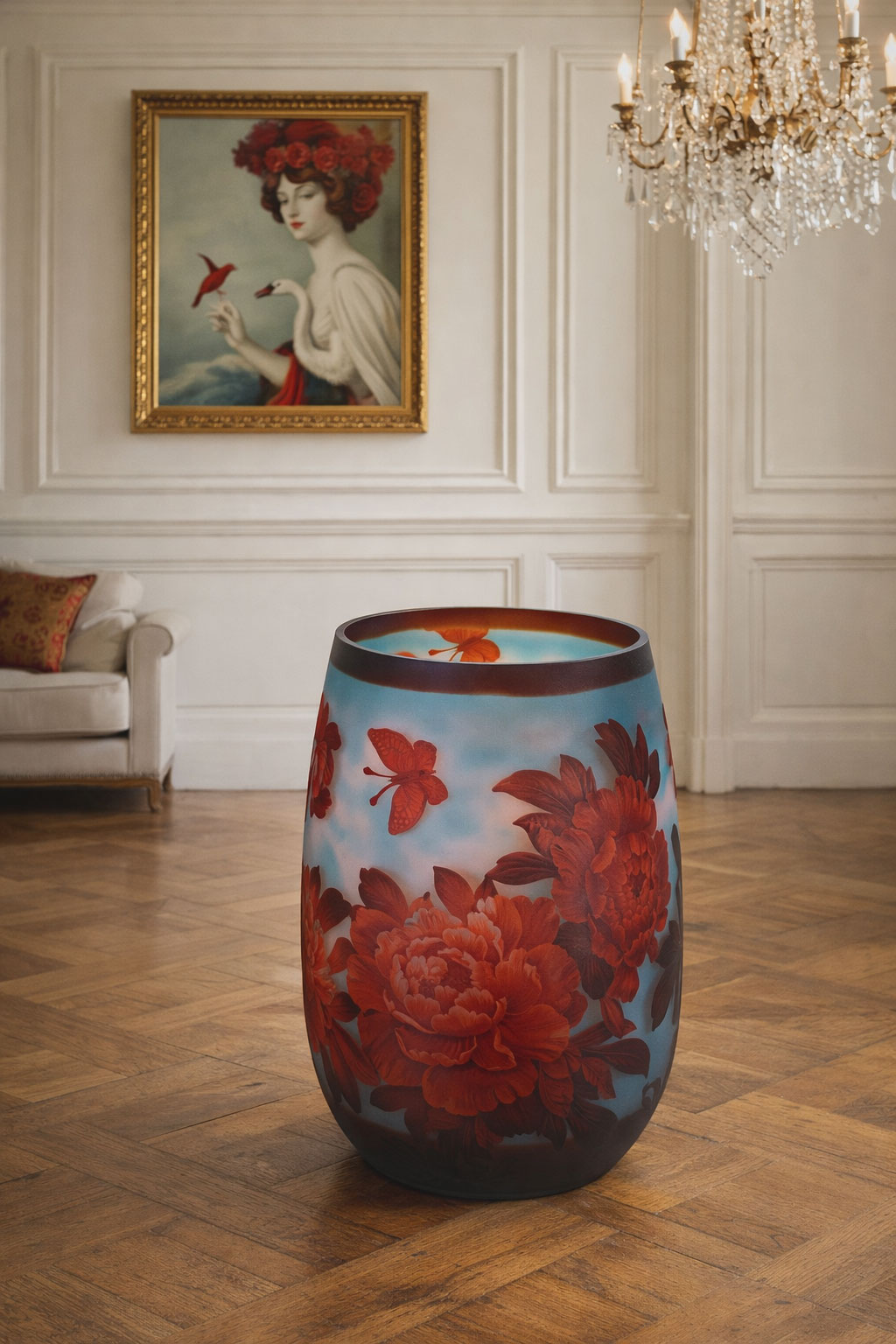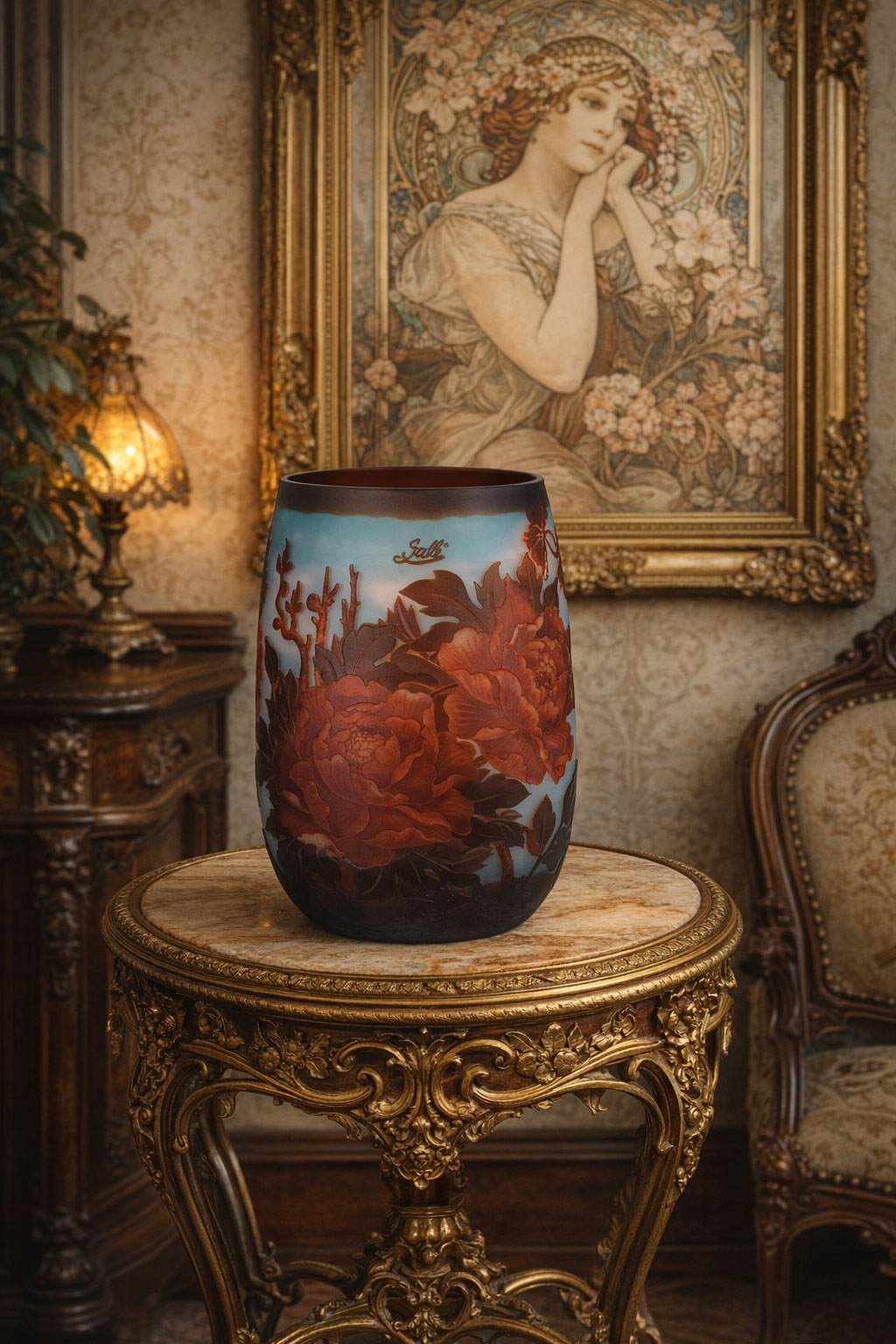 Die harmonische Farbkomposition unterstreicht die elegante Gestaltung im klassischen Jugendstil (Art Nouveau). Die floralen Motive und die sanften Farbverläufe erinnern an die Naturdarstellungen, die für die Glasarbeiten der Belle Époque typisch sind.
