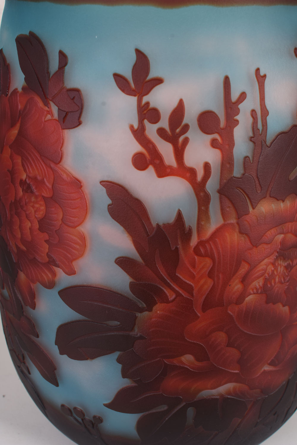 Diese große Vintage-Vase wurde aus schwerem, dickwandigem Glas gefertigt und besticht durch ihre hochwertige handwerkliche Verarbeitung. Die Oberfläche ist kunstvoll geätzt und zeigt ein meisterhaft gestaltetes Blumenmotiv im Halbrelief, das der Vase eine besondere Tiefe und plastische Wirkung verleiht.