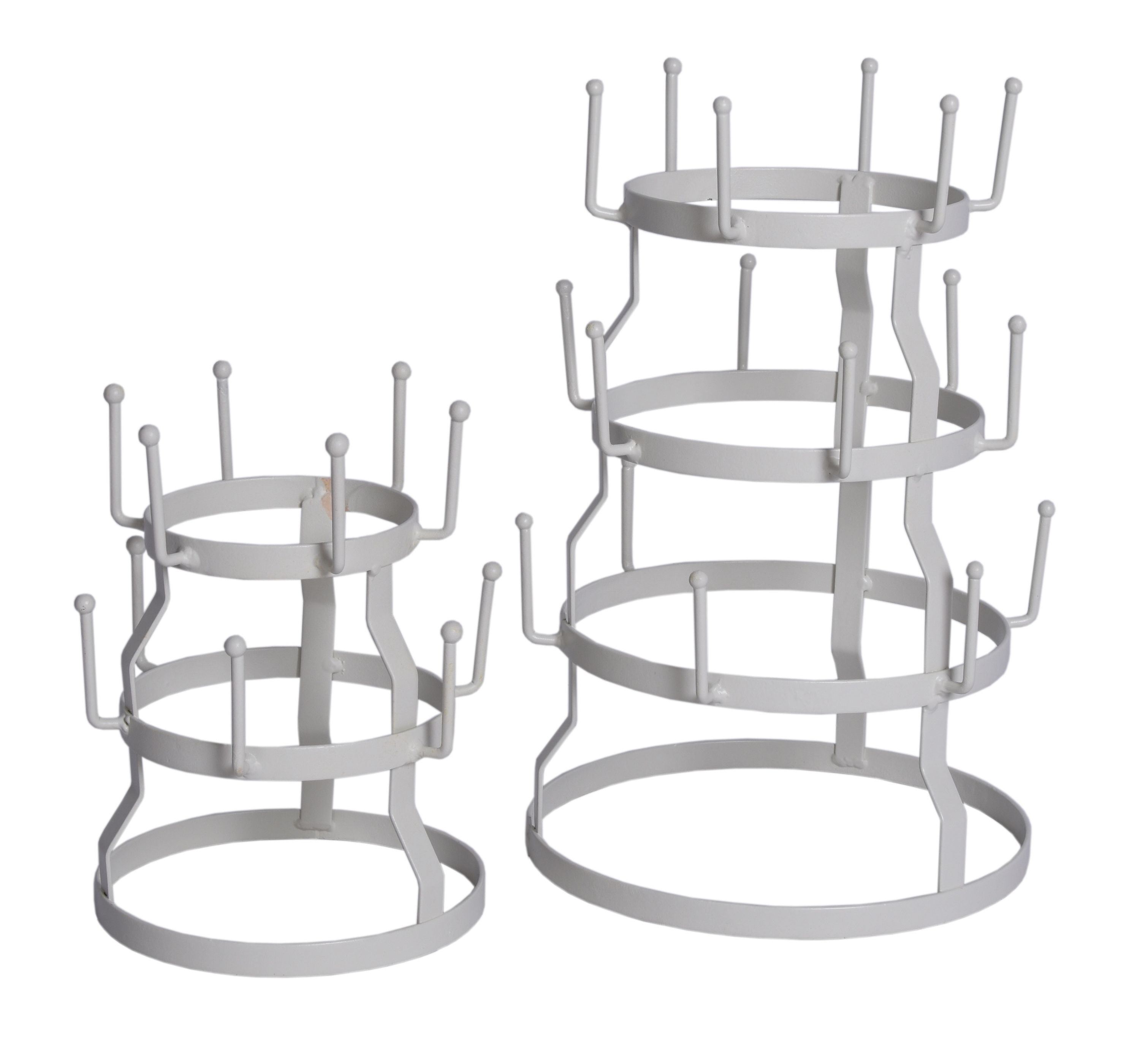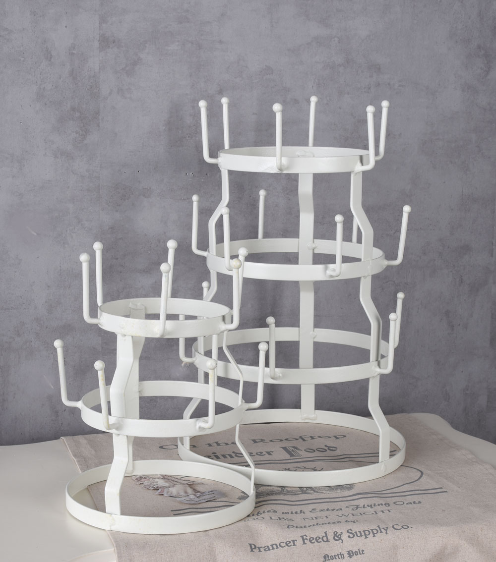 Gefertigt aus bemaltem Metall mit Antik-Oberfläche, erinnert er an traditionelle Café-Ausstattungen vergangener Zeiten. Der Halter besteht aus zwei separat verwendbaren Teilen, die sich zu einem großen Tassenständer zusammenstecken lassen – ideal, um Tassen, Becher oder Küchenaccessoires dekorativ aufzuhängen.