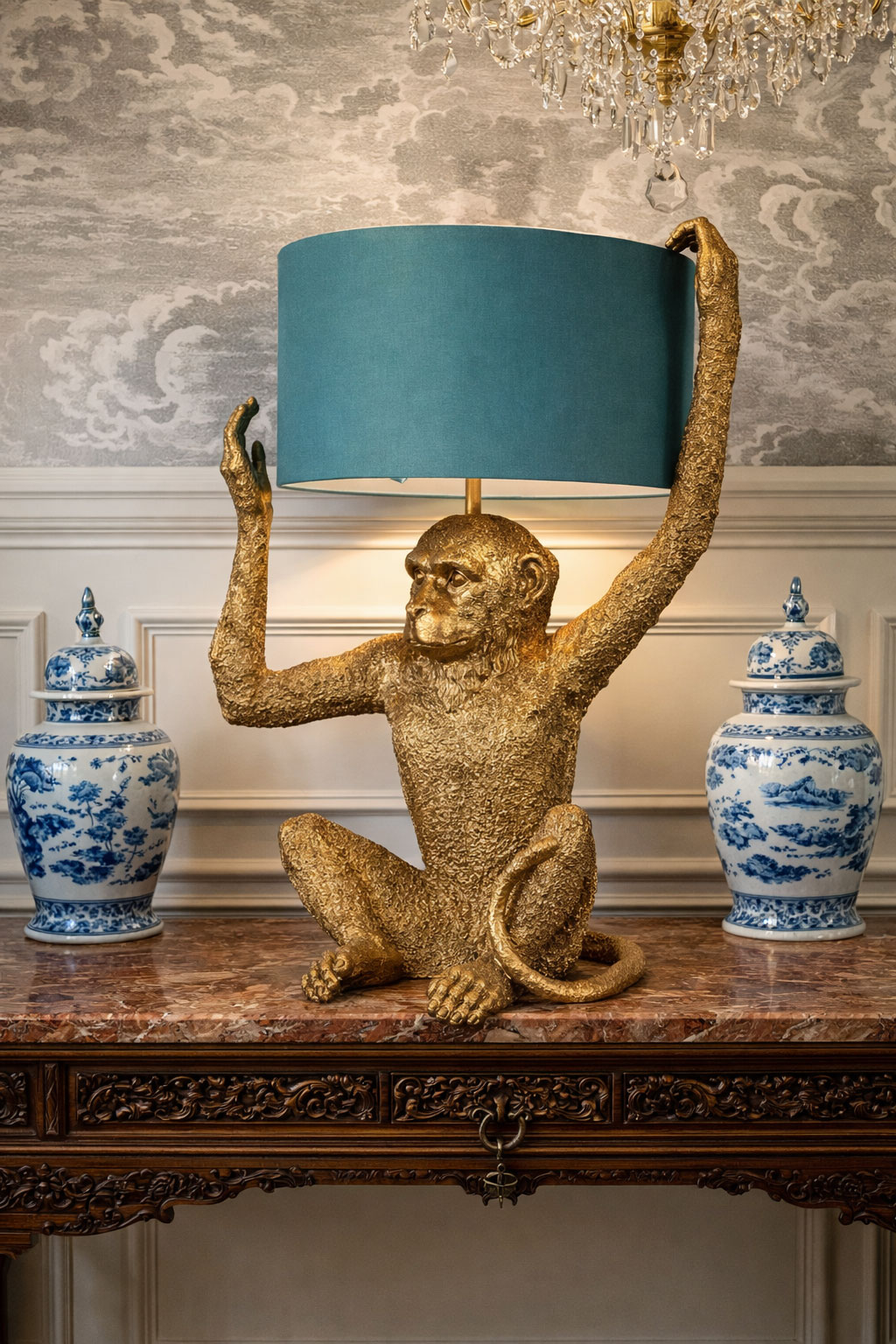 Der sitzende Affe ist aus hochwertigem Kunstharz gefertigt, aufwendig goldbemalt und wird durch einen dekorativen Stoffschirm harmonisch ergänzt, der für eine angenehme und wohnliche Lichtstimmung sorgt.