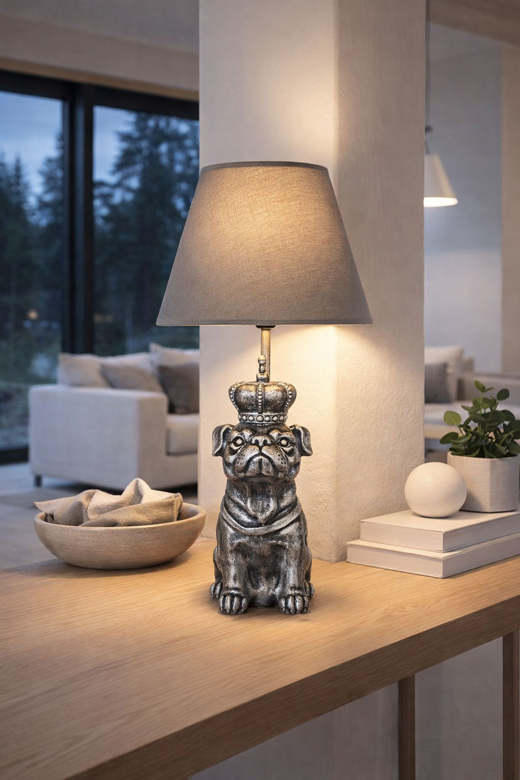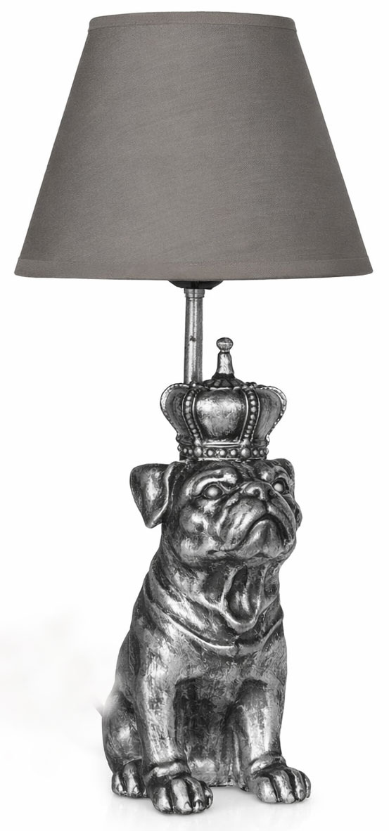 Königliche Tischlampe mit charmanter Mops-Skulptur in Silberoptik. Die dekorative Hundefigur als Lampenfuß und der schlichte Stoffschirm sorgen für stilvolle Akzente und angenehmes Licht. Gesamthöhe ca. 40 cm / Durchmesser ca. 18 cm Ohne Dekoration.