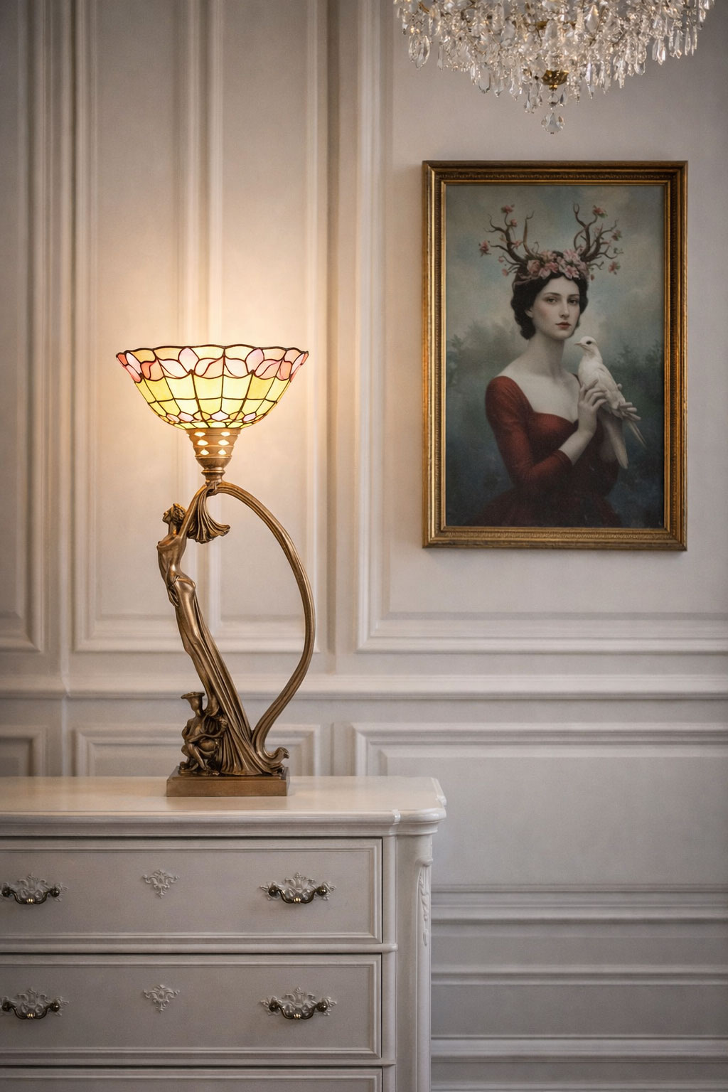 Im Mittelpunkt steht die anmutige Frauenfigur, die als kunstvoll gestalteter Lampenfuß dient und dem Objekt eine besonders edle und lebendige Ausstrahlung verleiht. Der detailreich gearbeitete Lampenschirm im Tiffany-Stil sorgt für ein warmes, stimmungsvolles Licht und unterstreicht den romantischen Charakter dieser außergewöhnlichen Tischleuchte.