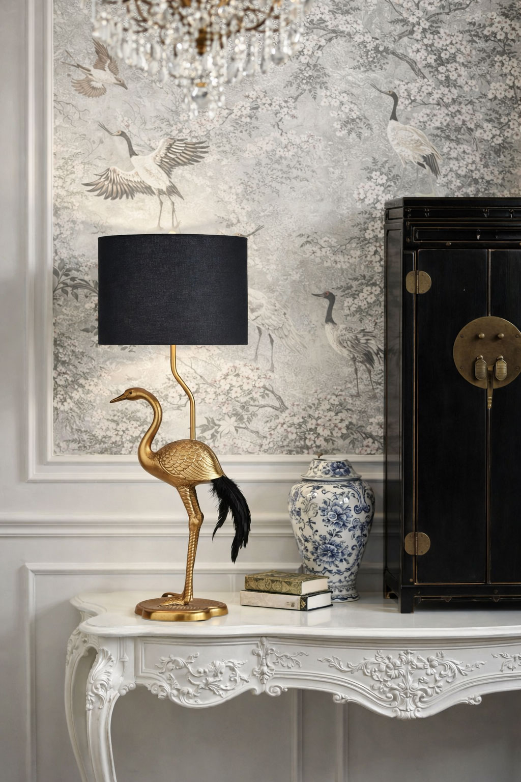 Exotischer Glamour für Ihr Zuhause: Die Tischleuchte im Chinoiserie Stil mit goldenem Kranich und schwarzem Schirm setzt luxuriöse Akzente.