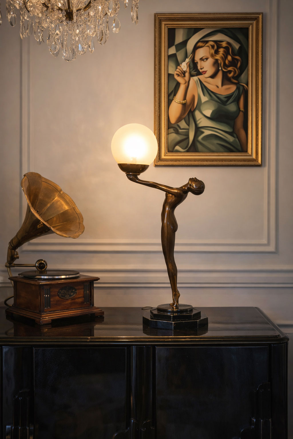 Elegante Art-Deco Tischlampe mit Frauenfigur und Milchglas-Kugel – inspiriert von den 1920er Jahren.