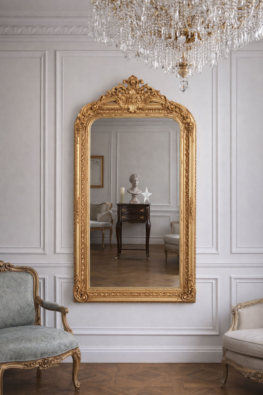 Mit einer Höhe von etwa 156 cm, einer Breite von ca. 85 cm und einer Tiefe von rund 8 cm besitzt dieser Trumeau-Spiegel eine imposante Präsenz und eignet sich ideal als Blickfang über dem Kamin, im Salon, im Flur oder in repräsentativen Wohnräumen.