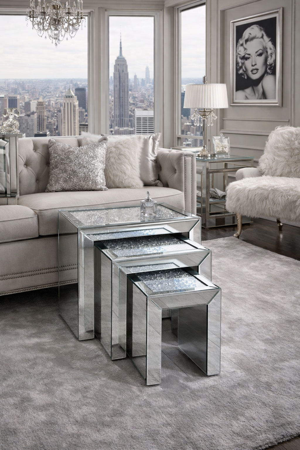 Die verspiegelten Beistelltische „Hollywood“ im Crushed Diamond Design bringen luxuriösen Glamour und funkelnde Eleganz in jeden Wohnraum.
