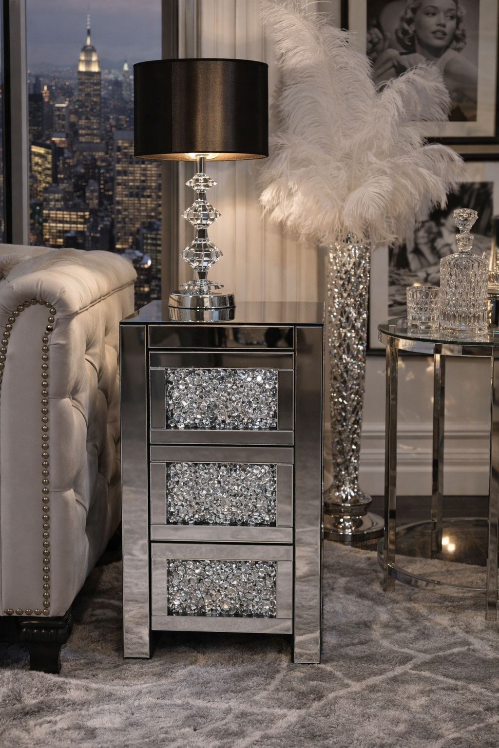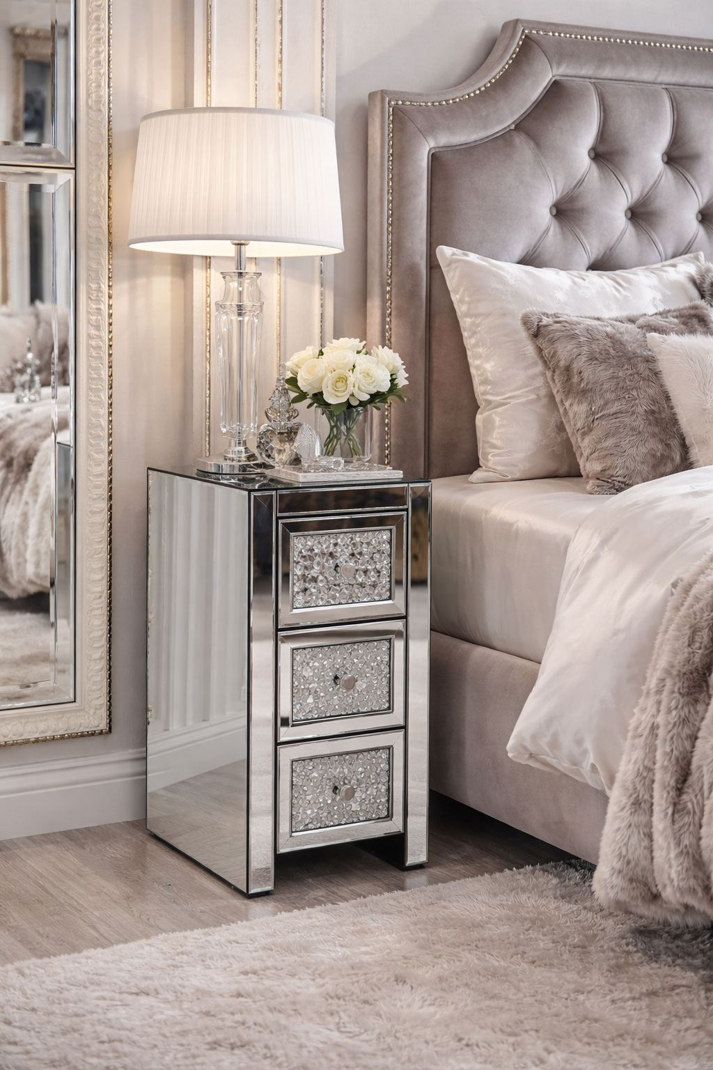 Glamourös verspiegelter Glas Nachttisch mit eleganten Diamantgriffen und praktischen Soft Close Schubladen