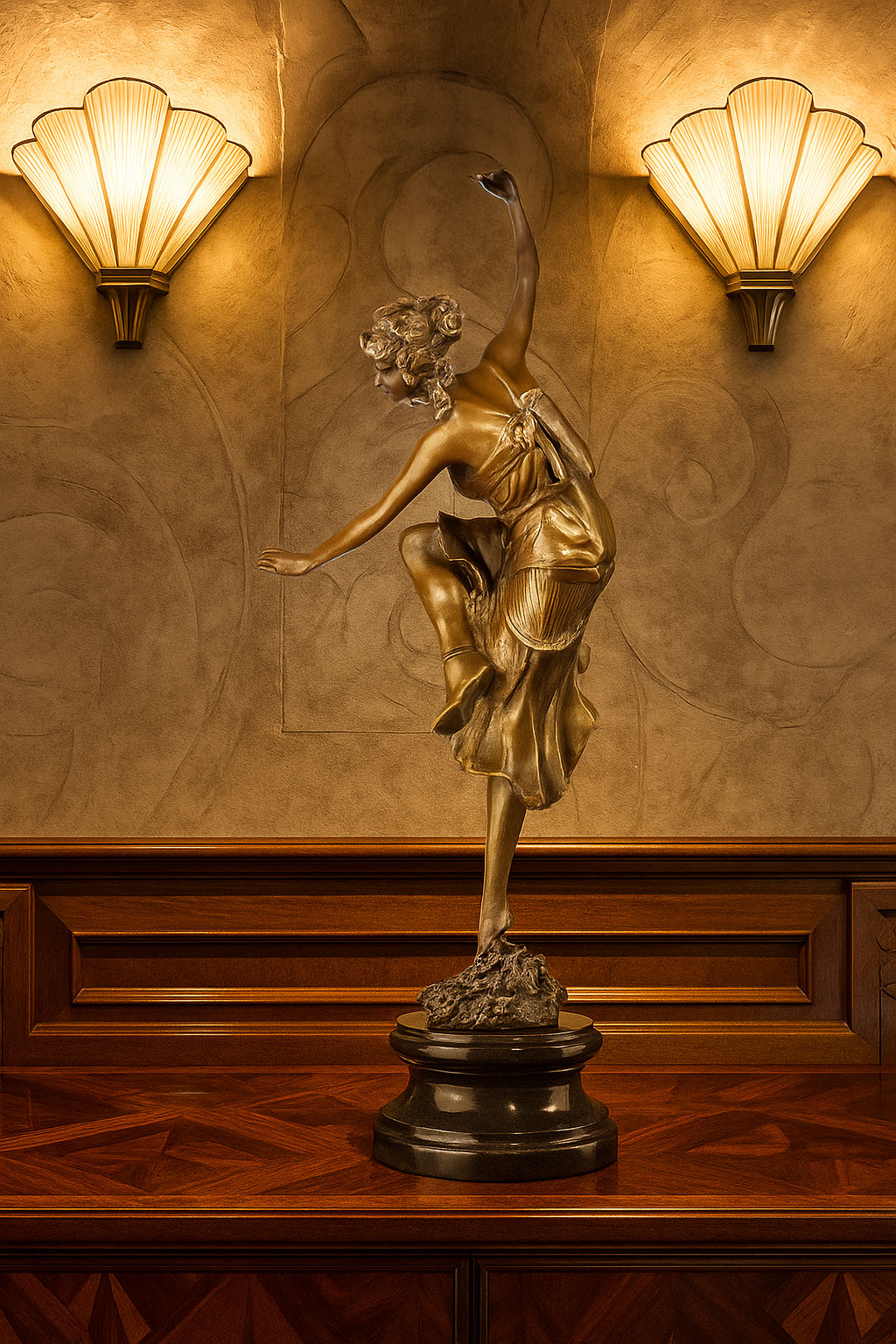Die elegante Linienführung und das harmonische Zusammenspiel von Körper, Drapierung und Sockel spiegeln perfekt den Glamour und die Exotik der 1920er Jahre wider – eine Zeit, in der Tanz, Kunst und Stil eine unvergleichliche Verbindung eingingen.
