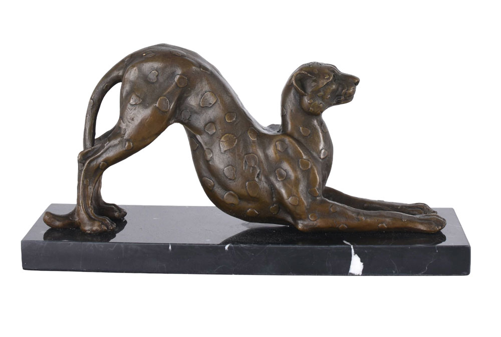 Diese detailreich gearbeitete Skulptur aus massiver Bronze ruht auf einem echten Marmorsockel und besticht durch ihre geschwungene Linienführung und die kraftvolle Körperspannung des Tieres.