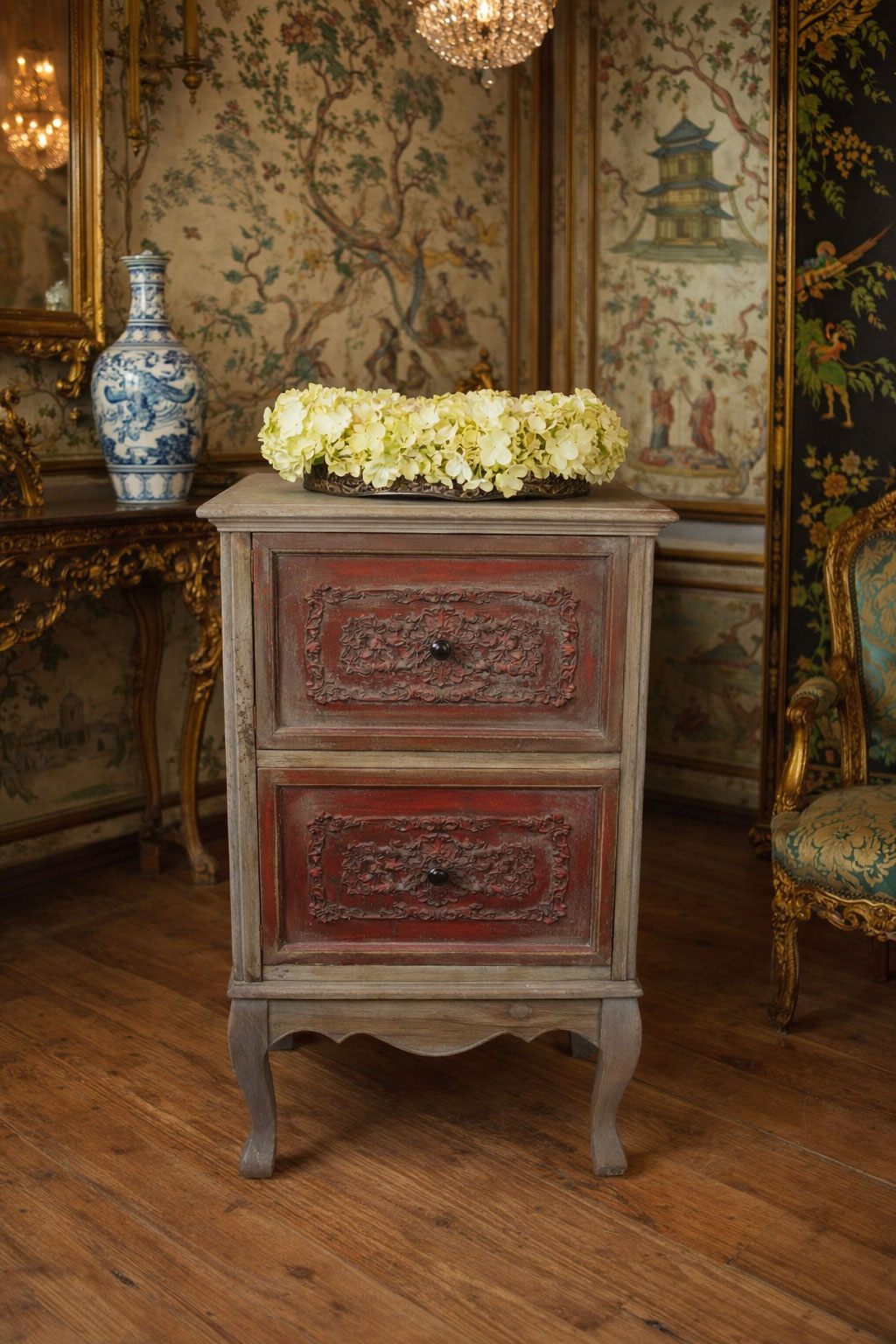 Stilvolle Vintage-Kommode im Chinoiserie Style aus altem Holz – rustikaler Charme trifft zeitlose Eleganz im angesagten Cottage Look. Höhe ca. 83 cm / Breite ca. 50 cm / Tiefe ca. 37 cm