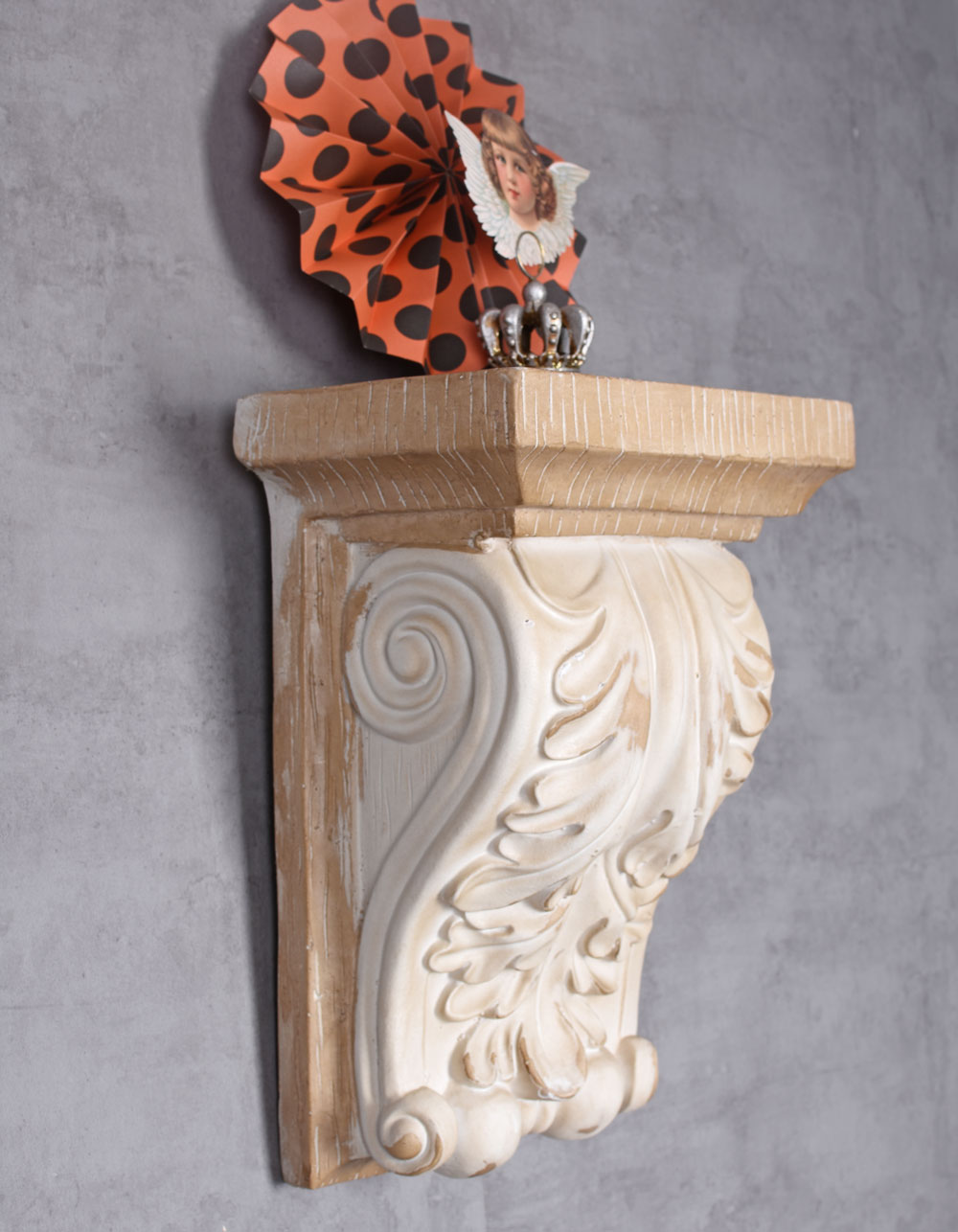 Die Wandkonsole „Chateau Marmont“ bringt mit Rokoko-Ornamenten und antiker Patina barocke Eleganz an jede Wand.