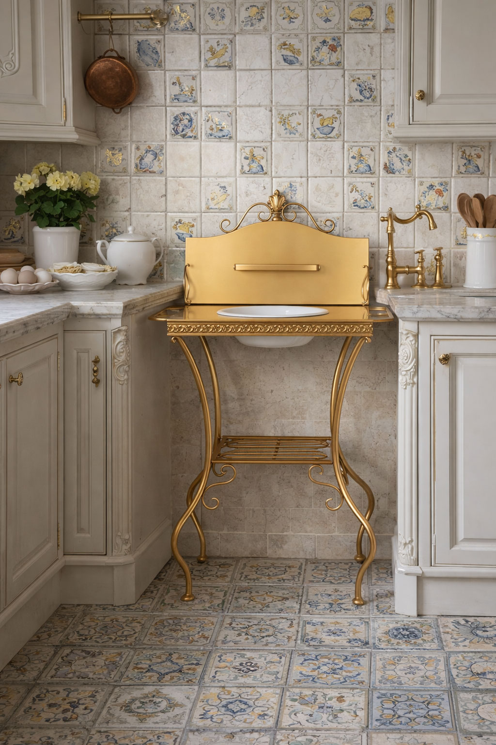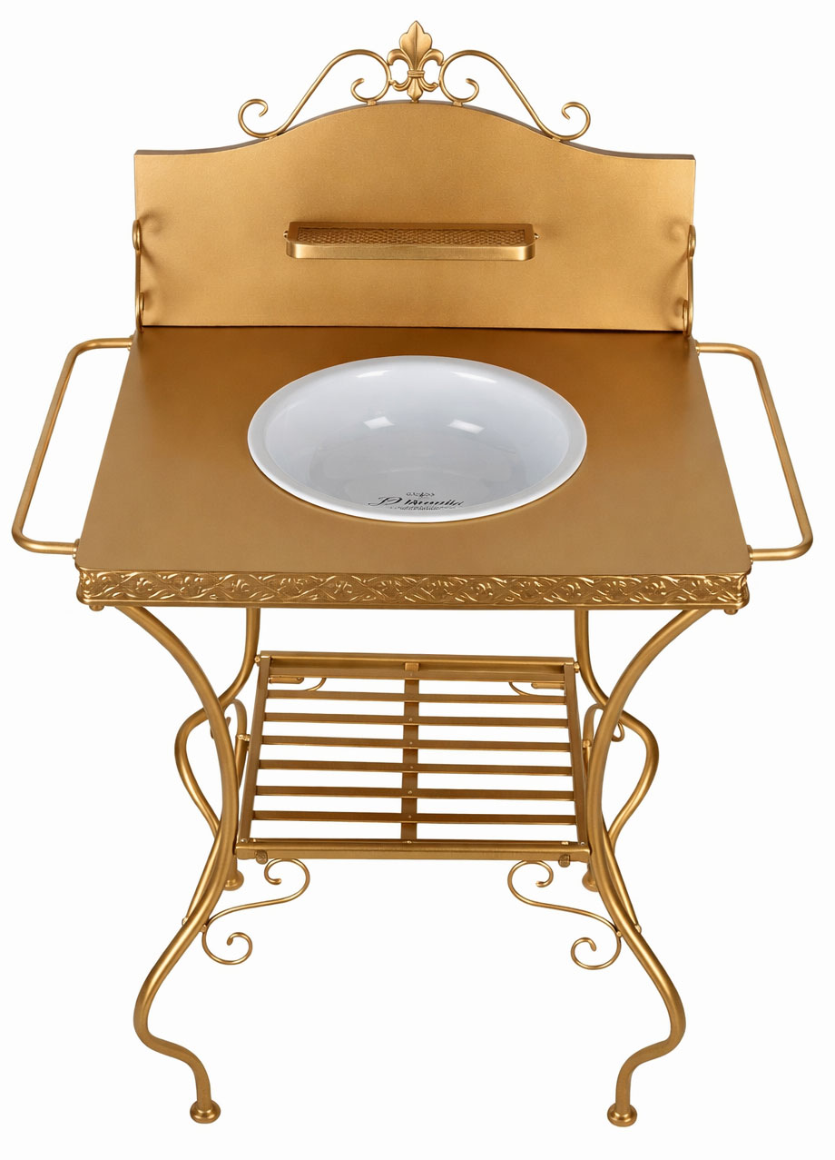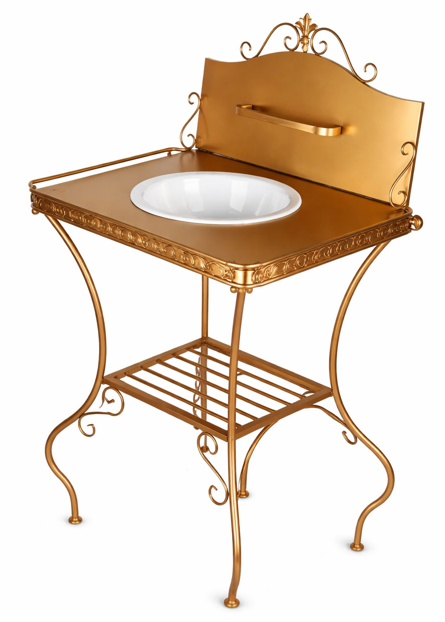 Romantische Waschkonsolen im Shabby-Chic-Stil: Die goldene Waschkonsole „Maison Shabby Chic“ mit Emaille-Schüssel, Seifenschale und Handtuchhalter bringt nostalgischen Landhaus-Charme in Bad, Garten oder Wohnbereich.