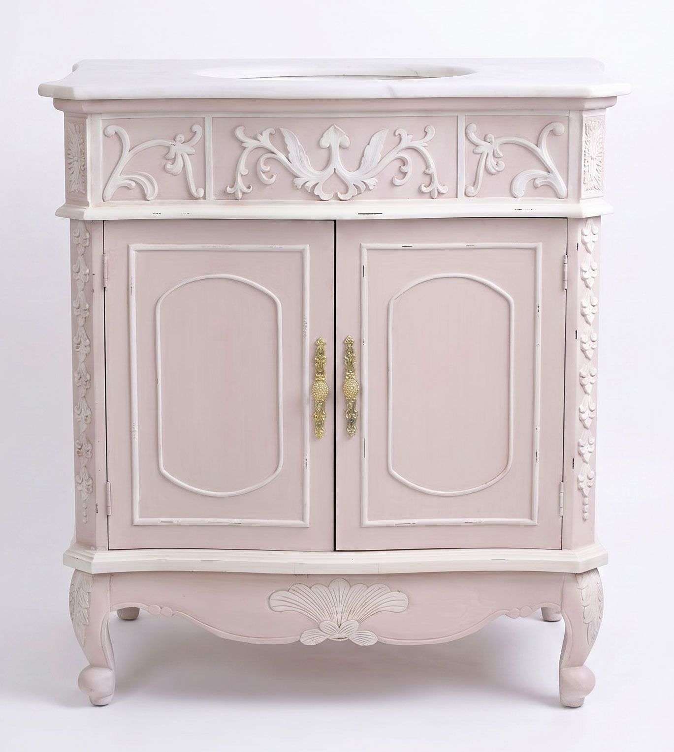 Gefertigt aus Holz und MDF und veredelt mit aufwendig handgearbeiteten Schnitzereien, überzeugt der Waschtisch durch seine detailreiche Gestaltung und authentische Ausstrahlung. Die antik-weiß lackierte Oberfläche mit feinen, bewusst eingearbeiteten Unregelmäßigkeiten unterstreicht den Vintage-Charakter und macht jedes Stück zu einem echten Unikat.
